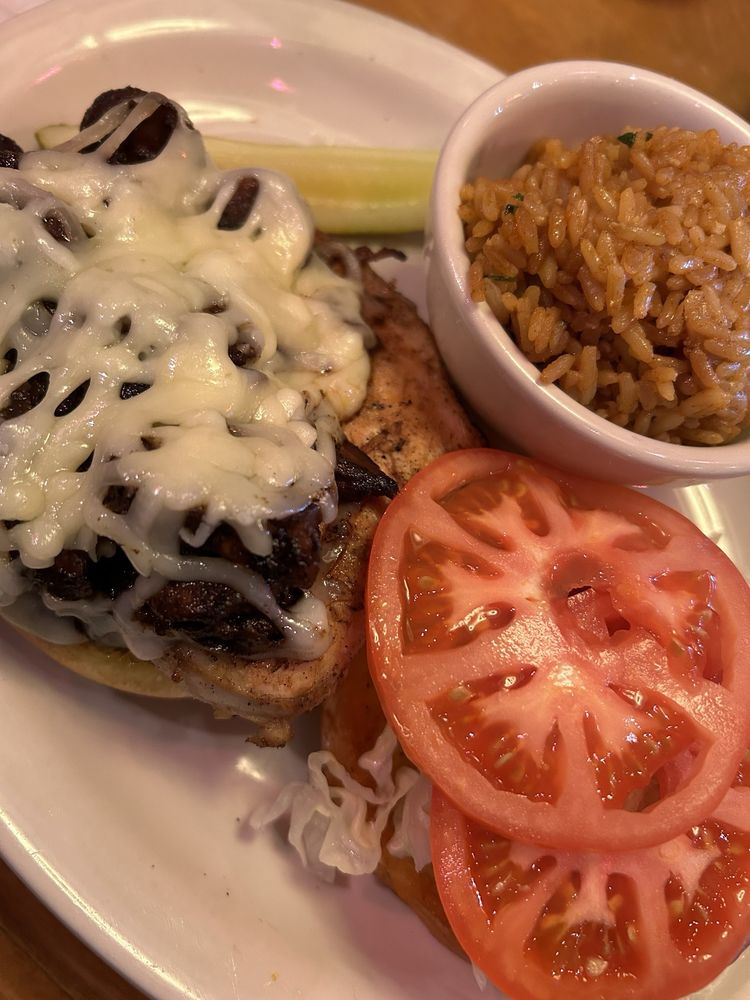 Fresh chicken breast with saut-ed mushrooms. melted jack cheese, lettuce, tomato and onion served on a Texas-sized bun with steak fries and a pickle spear