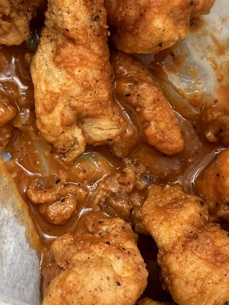 All white meat chicken tenders, golden-fried and lightly crispy. Served with choice of two sides.